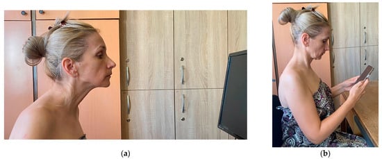 (a) Forward head posture (FHP), which is sometimes called the desktop neck posture; (b) text neck posture (TNP)—examples given by one of the examiners in the study.