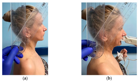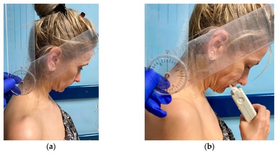 (a) Measurement of the neck flexion angle with a manual goniometer in TNP; (b) T-Scan registration in TNP.