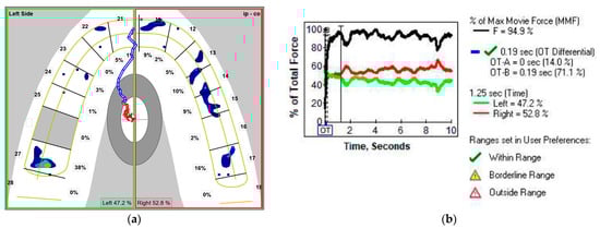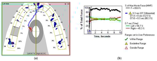 - Distribution of the occlusal force between the left and right SSS side of the arch (Figure 4a and Figure 5a). The ideal occlusion has 50% of the occlusal force on each side, but the T-Scan III System Manual states that a distribution of 53% to 47% of the occlusal force can be considered within the normal range []. Based on these values, we calculated the asymmetry index of the occlusal force (AOF) according to the formula []:AOF has normal values ranging from 0 to 6%.AOF (%) = [(occlusal force on the right side−occlusal force on the left side)/total occlusal force] × 100