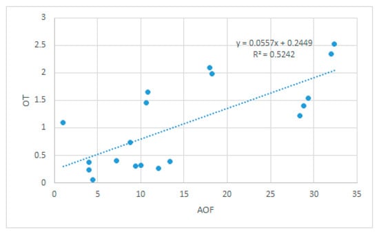 The correlations between MAT-OTB and the other three studied parameters were not conclusive. The correlation between OT and MAT-OTB was insignificant, inverse, and weak (Spearman’s rho = −0.154, p = 0.530). The same was valid for the correlation between MAT-OTB and %MMF (Spearman’s rho = −0.165, p = 0.499). The correlation between MAT-OTB and AOF was non-linear and insignificant (Spearman’s rho = 0.043, p = 0.861).