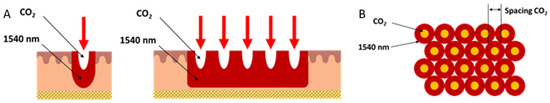 Therefore, the second wavelength, 1540 nm alone, does not introduce any effect that can morphologically modify the tissue, but instead promotes neocollagenesis while completely sparing the epidermis from damage, and when 1540 nm is used in combination with CO2, its coagulative peculiarities are increased and enhanced, thus splitting the proportionality between ablation and coagulation. This coagulative extension effect under the healthy epidermis, i.e., between the two consecutive CO2 DOTs, generates, thanks to 1540 nm, a more uniform remodeling and simulates the request that was obtained with traditional resurfacing but now has healing times equivalent to fractional CO2 alone.
