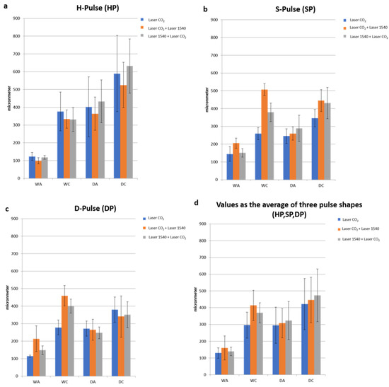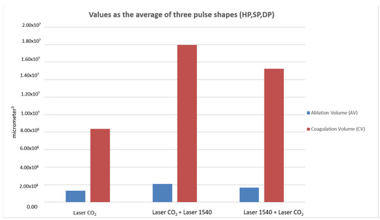 When comparing ablative to sequential irradiations, the synergy of the two wavelengths did not alter the typical pulse shape (HP-SP-DP) of the 10.600 nm laser alone. With the same pulse shape, the DA and the WA did not vary with the synergy of the two wavelengths, while WC (coagulation) increased compared to CO