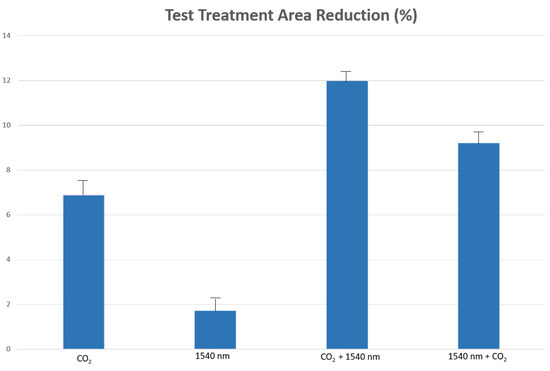 2 − 1540 nm sequential emission mode (TEST 3) led to an area reduction of 11.96%, much higher than the reduction in areas obtained with the single wavelengths (TEST 1). Even the percentage values of the reduction in areas from the synergy of the two wavelengths (area reduction CO