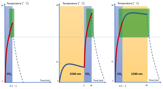 2 laser allows the necessary temperatures for denaturing the collagen fibers to be reached in a few milliseconds, but these temperatures drop rapidly, allowing only the area surrounding the ablative vallus to be coagulated. When using both wavelengths in the 1540–10.600 nm sequence, the 1540 nmwavelength preheats the tissue and allows the CO