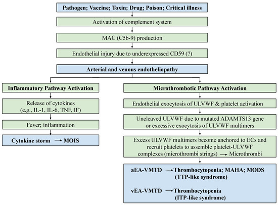 Pathogenesis of endotheliopathy based on “two-activation theory of the endothelium”. Endothelial molecular pathogenesis is initiated by the activated complement system following exposure to a pathogen, toxin, drug, poison, venom, vaccine, polytrauma, hyperglycemia, severe hypertension, and others. Endotheliopathy releases inflammatory cytokines and hemostatic factors, and activates two clinically important pathways: inflammatory and microthrombotic. Both arterial endotheliopathy and venous endotheliopathy provoke inflammation via the inflammatory pathway, leading to inflammatory syndrome, such as MOIS due to cytokines, but arterial endotheliopathy promotes microthrombosis via the microthrombotic pathway and produces aEA-VMTD due to the activation of the ULVWF path of hemostasis. Arterial endotheliopathy is characterized by the triad of thrombocytopenia, MAHA, and MODS, which is called “TTP-like syndrome”, but venous endotheliopathy is characterized by ITP/“ITP-like syndrome” due to silent microthrombi with consumptive thrombocytopenia, as explained in the text. The distinguishing features are caused by the different anatomies, physiological functions, and hemodynamic characteristics between arterial system and venous system. These are very important pathophysiological features in the understanding of the complexity in variable phenotypes amongst the endotheliopathic syndromes. Abbreviations: EA-VMTD: endotheliopathy-associated vascular microthrombotic disease; ITP: immune thrombocytopenic purpura; MAC: membrane attack complex; IF: interferon; IL: interleukin; MAHA: microangiopathic hemolytic anemia; MODS: multiorgan dysfunction syndrome; MOIS: multiorgan inflammatory syndrome; TNF: tumor necrosis factor; TTP: thrombotic thrombocytopenic purpura; aEA-VMTD: arterial EA-VMTD; vEA-VMTD: venous EA-VMTD; ULVWF: ultra-large von Willebrand factor.