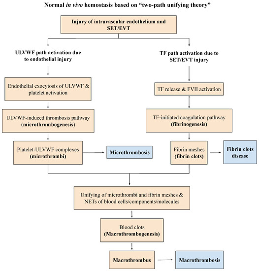 According to recently proposed “two-activation theory of the endothelium”, depicted in Figure 1, endotheliopathy leads to the activation of two molecular pathways, “inflammatory” and “microthrombotic”, promoting inflammation and microthrombosis, respectively [4,5,6]. This theory delineates that two pathways are completely independent, but are concurrent events that promote two different molecular pathogeneses. Additionally, the “two-path unifying theory” of hemostasis in vivo (Figure 2), the genesis of microthrombosis (i.e., VMTD), was established to be the result of partial hemostasis triggered by ultra-large von Willebrand factor (ULVWF) path of hemostasis. In disseminated endotheliopathy, inflammation and microthrombogenesis often coexist, but they each promote separate pathogeneses, producing many distinctly different and combined clinical phenotypes [6,10].