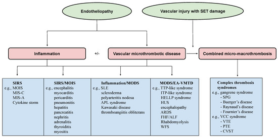Endotheliopathy is a very common vascular disorder that develops due to functional and/or anatomical changes in the endothelium, which results in serious molecular responses that produce a variety of human diseases. This condition is triggered by the activated complement system secondary to external insults, such as the toxin of pathogen and polytrauma, or to internal physiologic changes, such as pregnancy and autoimmune disease [1,2,3]. It promotes two endothelial molecular pathways: inflammatory and microthrombotic [4,5,6,7,8]. Both inflammation and microthrombosis occur commonly in sepsis and critical illnesses [4,5,6,7,8,9,10] due to the released molecules from endotheliopathy caused by the toxin of pathogen, drug, poison, chemical, vaccine, or venom, and from functional changes after surgery, transplant, or polytrauma [5,6]. Inflammation and disseminated vascular microthrombotic disease (VMTD) often simultaneously occur, and they cause a variety of phenotypes of clinical pathology. The endothelial damage provokes major molecular and biological events, and it produces a spectrum of clinical disorders, from focal, multifocal, localized, and disseminated disease to multisystem inflammatory syndrome (MOIS) and multiorgan dysfunction syndrome (MODS), not only due to the cellular response and hemostatic activation, but also due to the delayed autoimmune response [11,12,13,14].