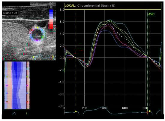 - Saito, M.; Okayama, H.; Inoue, K.; Yoshii, T.; Hiasa, G.; Sumimoto, T.; Nishimura, K.; Ogimoto, A.; Higaki, J. Carotid Arterial Circumferential Strain by Two-Dimensional Speckle Tracking: A Novel Parameter of Arterial Elasticity. Hypertens. Res. 2012, 35, 897–902. [Google Scholar] [CrossRef] [PubMed]