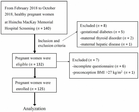 This is a prospective cross-sectional observation study to investigate the VD status in Taiwanese pregnant women and the effects of VD supplementation as well as macronutrient intake on serum 25-hydroxy-vitamin D (25[OH]D) level. From February 2018 to October 2018, we conducted a total of 125 healthy pregnant women who had prenatal visits at Hsinchu MacKay Memorial Hospital (Hsinchu City, Taiwan) in this study. The study inclusion criteria were as follows: age ≥ 18 years, average daily outdoor sunlight exposure of <30 min, singleton pregnancy, preconception body mass index (BMI) of <27 kg/m2, VD supplementation at a dose of <1000 IU/day during pregnancy, and without systemic and autoimmune diseases. The exclusion criteria included pregnant women with preterm labor, gestational diabetes or diabetes, preeclampsia, oligohydramnios, or polyhydramnios, history of repeated abortion, rheumatoid arthritis, thyroid or parathyroid disorders, hepatic and renal diseases, and history of using aspirin, anticonvulsants, or immunosuppressive drugs. Altogether, 140 pregnant women were recruited; of these, 125 were enrolled and completed the study questionnaire (Figure 1). The Institutional Review Board of MacKay Memorial Hospital approved the study protocol (17MMHIS088e).