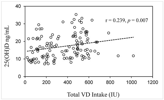 Correlation between serum 25(OH)D level and total VD intake (n = 125).