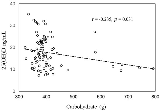 Correlation between serum 25(OH)D level and amount of carbohydrate intake among pregnant women with ≥300 g/day carbohydrate intake (n = 85).