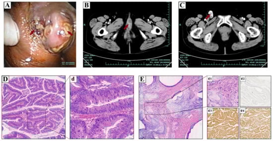 With the development of a tumor, the patient was re-admitted with a change in the urination path and external urethral orifice itching over the previous 1 month in the 6th year after the initial operation (in 2016). Vaginal examination found a pedicled mass measuring approximately 3.0 × 1.5 cm in the external urethral orifice at 11 o’clock position, without tenderness and bleeding. In addition, one enlarged lymph node about 3.0 cm in diameter was palpated in the right inguinal region, which was hard and mobilized but free of tenderness. Meanwhile, cystourethroscopy also showed a pedicled mass measuring approximately 3.0 × 1.6 cm at the external urethral orifice (Figure 3A). An enhanced pelvic computed tomography (CT) scan indicated a 3.1 × 1.9 cm solid cystic mass adhering on the external urethral orifice, and uneven enhancement after contrast administration (Figure 3B). The right groin had an elliptical high-density shadow, about 3.0 × 1.5 cm, with multiple spot-like calcifications seen inside, and none enhancement after contrast administration. Besides, there was an enlarged lymph node shadow beside the right iliac blood vessel, about 1.6 × 0.7 cm (Figure 3C). The results of routine blood tests and further blood chemistry showed no abnormal indicators ([which included the normal range of carcinoembryonic antigen 19-9 (CA19-9), α-fetoprotein (AFP) and prostate-specific antigen (PSA)). The patient was treated with extended urethral mass excision to ensure an adequate margin, and the biopsy of the right enlarged inguinal lymph node was also performed intraoperatively. Subsequent routine pathology of H&E reported the invasive mucinous type of urethral adenocarcinoma (moderate to well differentiation) (Figure 3D,d), which was consistent with the previous pathology report. In addition, the H&E pathology of the right inguinal enlarged lymph node biopsy also confirmed metastatic mucinous adenocarcinoma (Figure 3E,e1). Immunohistochemically, the tumor cells were positive for CK7, CK20, CDX2, MUC1, MUC2, MUC5AC and MUC6, while GATA-3 and p63 were negative (Figure 3e2–e4). Considering the poor prognosis of the patient with surgery alone, we recommended that the patient receive further local radiotherapy or systemic chemotherapy to improve prognosis under the current clinicopathological stage (T3N2M0). However, the patient rejected our proposal and recovered gradually in 1 week and healed satisfactorily.