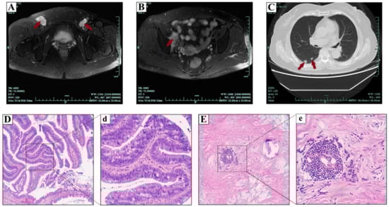 Imaging examinations and histopathologic features of the Case 2 in 2020. (A) Enlarged lymph nodes with marked enhancement were seen in the bilateral inguinal regions. (B) An abnormal mass signal shadow with approximate dimensions of 3.4 × 2.0 cm in the right iliopsoas muscle, with equal signal in T1- weighted images and higher in T2- and even enhancement after contrast administration. (C) Pulmonary CT scan indicated multiple high-density nodules in both lungs, which were considered metastatic nodules first. (Red arrows indicate the corresponding foci). H&E staining of low-power (4 × 10 magnification) and high-power (40 × 10 magnification) view showing the metastatic mucinous adenocarcinoma were present in the bilateral inguinal lymph nodes (D,d) and right iliopsoas mass (E,e).