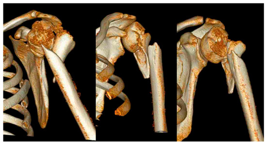 Intermuscular fractures of the metaphyseal humerus are characterized by diverging fragments of the metaphyseal region due to traction by the muscles surrounding the shoulder. Fracture morphologies vary depending on the extent of the pull of individual shoulder muscles (Figure 1 and Figure 2). Usually, anterior fragments are displaced by the pectoral muscles and the posterior fragments—by the deltoid and latissimus dorsi muscles. The forces exerted by these muscles cause a higher degree of displacement and can make exact anatomical reconstruction more challenging and prone to complications [7].