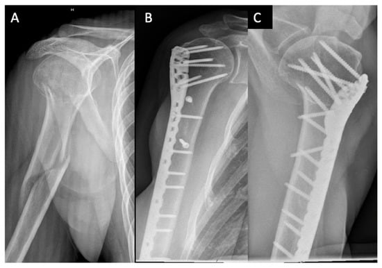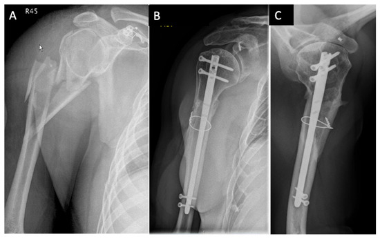 - Stedtfeld, H.W.; Biber, R. Proximal Third Humeral Shaft Fractures -- a Fracture Entity Not Fully Characterized by Conventional AO Classification. Injury 2014, 45 (Suppl. S1), S54–S59. [Google Scholar] [CrossRef]