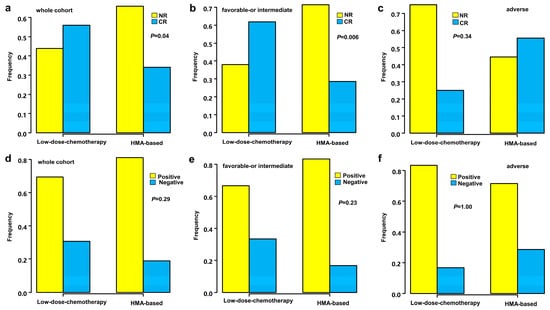Forty-three patients (45.7%) obtained CR after initial induction treatment. The CR rate in the HMA plus low-intensity chemotherapy group was 34.1% (15/44), and in the low-intensity chemotherapy group was 56.0% (28/50) (p = 0.04) (Figure 1a). According to the risk stratification of ELN, there were 36 (46.8%) patients with CR in favorable- or intermediate-risk cohort after initial induction, including 28.6% (10/35) in the HMA plus low-intensity chemotherapy group and 62.0% (26/42) in the single low-intensity chemotherapy group (p = 0.006) (Figure 1b). In the adverse-risk cohort, there were 7 (41.2%) patients with CR after initial induction, including 55.6% (5/9) in the HMA plus low-intensity chemotherapy group and 25.0% (2/8) in the single low-intensity chemotherapy group (p = 0.34) (Figure 1c).