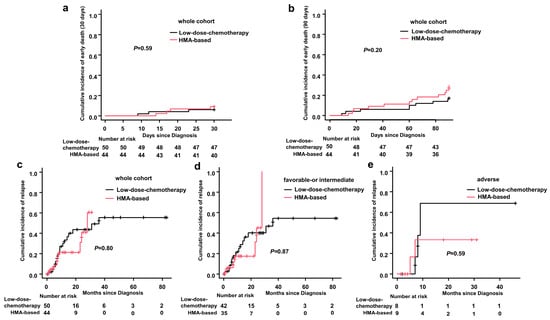 Early death and relapse: (a) early death in the first 30 days for the whole cohort; (b) early death in the first 90 days for the whole cohort; (c) relapse for the whole cohort; (d) relapse for favorable- or intermediate-risk patients; and (e) relapse for adverse-risk patients. Abbreviations: HMA-based, hypomethylating agents combined with low dose chemotherapy.