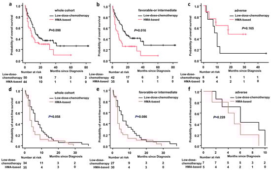 All patients were followed up to 31 March 2022 through our electronic medical record system or outpatient or telephone contact, and the information was reliable. At the end of follow-up, the median OS of patients in the HMA plus low-intensity chemotherapy group was eight months (range, 0.3–67). The median OS of patients in the single low-intensity chemotherapy group was 13.5 months (range, 2–83). The one-year OS rates for patients in the HMA plus low-intensity chemotherapy group and the single low-intensity chemotherapy group were 37.3% (95% Cl: 23.1%–51.5%) and 55.4% (95% Cl: 40.5–67.9%), respectively (p = 0.098) (Figure 3a). For favorable- or intermediate-risk patients, the one-year OS rate was significantly higher in the single low-intensity chemotherapy group than in the HMA plus low-intensity chemotherapy group, 63.7% (95% Cl: 47.2–76.3%) and 31.4% (95% Cl: 17.1–46.8%), respectively (p = 0.016) (Figure 3b). For adverse-risk patients, the one-year OS rates for patients in the HMA plus low-intensity chemotherapy group and the single low-intensity chemotherapy group were 47.6% (95% Cl: 12.3%–76.9%) and 12.5% (95% Cl: 0.7–42.3%), respectively (p = 0.165) (Figure 3c). The one-year EFS rates for patients in the HMA plus low-intensity chemotherapy group and the single low-intensity chemotherapy group were 8.5% (95% Cl: 2.2–20.6%) and 20.6% (95% Cl: 9.1–35.3%), respectively (p = 0.058) (Figure 3d). For favorable- or intermediate-risk patients, the 1-year EFS rates for patients in the HMA plus low-intensity chemotherapy group and the single low-intensity chemotherapy group were 10.0% (95% Cl: 2.5–23.6%) and 18.5% (95% Cl: 6.7–34.8%) (p = 0.086) (Figure 3e). For adverse-risk patients, the one-year EFS rates for patients in the HMA plus low-intensity chemotherapy group and the single low-intensity chemotherapy group were 20.0% (95% Cl: 0.84–58.2%) and 28.6% (95% Cl: 4.1–61.2%) (p = 0.228) (Figure 3f).