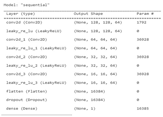 An overview of the discriminator GAN for several layer types, including conv2d, leaky ReLU, flatten, dropout, and dense, is shown in Table 2. The figure also shows the output variations in parameter for each layer type.