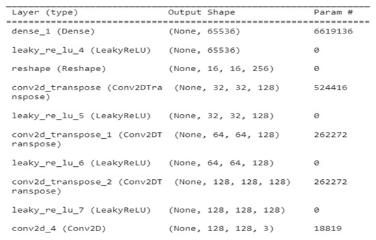 Figure 4 depicts a summary of generator GAN for several layer types such as Dense, leaky ReLU, reshape Conv2DT, and Conv2D, as well as the output shape of variation in param for each layer type.