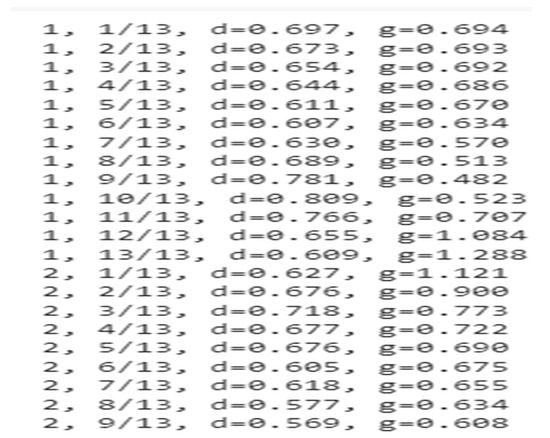 Figure 7 shows the parameter performance for both the discriminator and the generator summary of the GAN model by representing the generator and discriminator loss at every scan of each epoch.