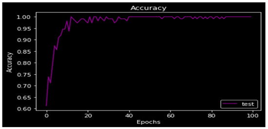 The accuracy of the model is displayed in Figure 10 at 97%. The accuracy of the model was calculated in discriminator using segmented truth from the generator minus the ground truth. The accuracy graphs are shown in the following figure, and as the number of epochs rises, accuracy also rises. When the model is put through 100 epochs of testing, the test accuracy rises.