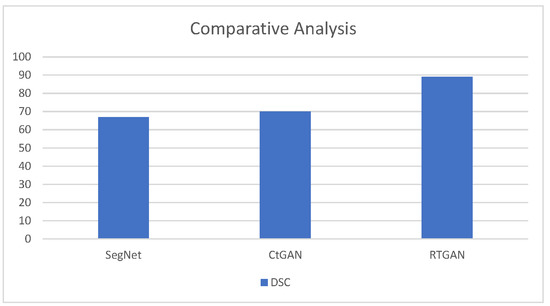 The model has been trained for 100 epochs, and the quality of the segmented images for some epochs is shown in Figure 8. The first part of image is the input image fed to the model. The second part is the maximum segmented region and last part is the final segmented output from the RTGAN model.