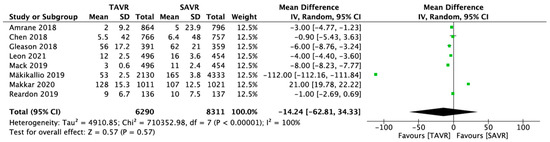 Eight trials evaluating the effectiveness of TAVR vs. SAVR were included. According to the analysis, in the long term, TAVR did not significantly reduce the incidence of stroke in the experimental population compared with the control population treated by SAVR intervention (Figure 3).