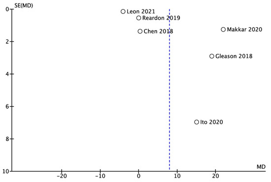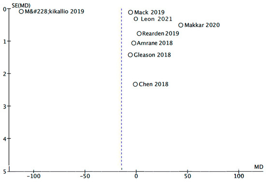 Funnel plot for publication bias (cardiogenic cause) [18,20,28,29,30].