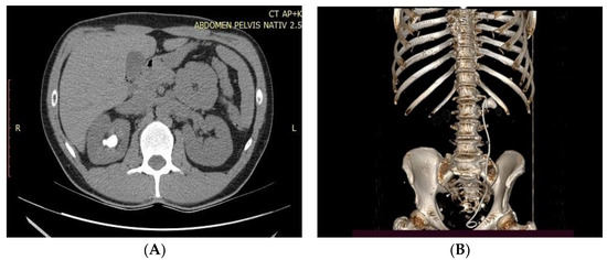 We retrospectively analyzed 250 consecutive patients with large renal solitary stones (stone burden between 2 and 4 cm) from 1 January 2019 to 31 December 2020. The patients were divided into two groups: group 1 (125 patients), in which the patients were treated by a retrograde flexible ureteroscopic approach, and group 2 (125 patients), in which patients were treated by percutaneous nephrolithotomy. Stone characteristics and anatomical data were observed based on the computed tomography (CT) and/or KUBradiography imaging archive. For larger stones, more than one session of flexible ureteroscopy was necessary. The preoperative CT images calculated the stone surface area based on the largest volume (length × width = mm2). The follow-up evaluation was undertaken one month after the operation using plain film of KUB(Kidney-ureter-Bladder) for opaque stones, ultrasonography for non-opaque stones, or non-contrast CT of the whole abdomen (Figure 1A,B).