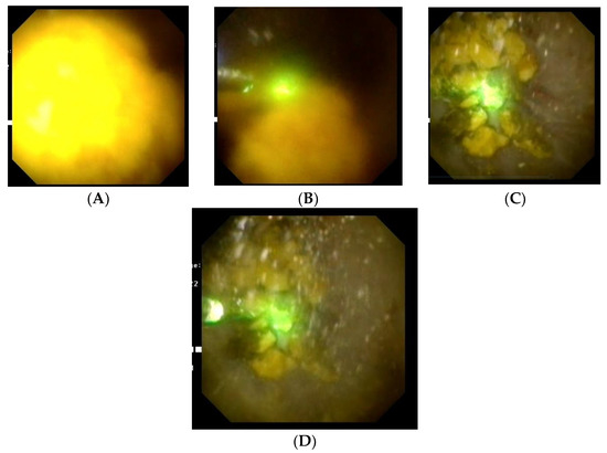 (A–D). Flexible ureteroscopy and Holmium laser lithotripsy of a large renal stone.