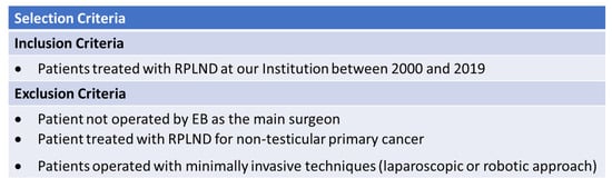 - Wells, H.; Hayes, M.C.; O’Brien, T.; Fowler, S. Contemporary Retroperitoneal Lymph Node Dissection (RPLND) for Testis Cancer in the UK—A National Study. BJU Int. 2017, 119, 91–99. [Google Scholar] [CrossRef] [PubMed]