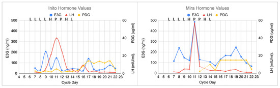 A single participant provided daily first morning urine samples starting on day 6 of the cycle. Urine hormones were analyzed with the CBFM and Mira monitors (described in detail in a previous study [1]) as well as with the Inito monitor (inito.com) using lateral flow assays (a sandwich assay for LH and a competitive assay for E3G). The CBFM measures E3G and LH on a single test stick, and the monitor provides “Low”, “High”, and “Peak” results, where “High” represents a rise in E3G and “Peak” represents passing the threshold level of LH (although this is proprietary information, “High” values are likely around 200 ng/mL of E3G, and “Peak” values are typically >30 mIU/mL of LH). The Mira monitor measures E3G and LH on a single test stick and PDG on a separate test stick and syncs via Bluetooth to the Mira App, which graphically displays the results. The Inito monitor mounts onto a smartphone with a clip customized to the phone and uses the phone’s camera with a controlled light in the device to measure the intensity of the lines on a single test strip measuring E3G, LH, and PDG (unpublished manufacturer data).