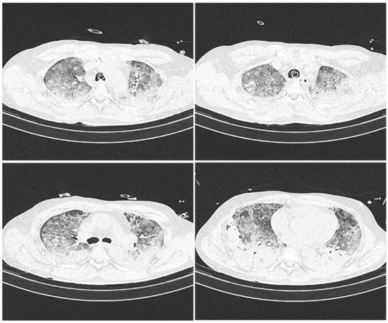 We present a prospective series of four reverse transcriptase-polymerase chain reaction (RT-PCR) COVID-19 positive patients with severe bilateral pneumonia complicated by ARDS and basal lobe atelectasis of both lungs, diagnosed by computed tomography (Figure 1), in whom segmental lung recruitment using independent lung ventilation was performed as a last resort method to stabilize rapidly deteriorating respiratory clinical parameters [12]. All patients were treated at the COVID Respiratory Center of the Department of Anesthesiology, Intensive Medicine and Pain Therapy, Clinical Hospital Center Rijeka, Rijeka, Croatia, according to the guidelines for COVID-19 pneumonia and ARDS [13]. The study was approved by the Ethics Committee of the Clinical Hospital Center Rijeka, Rijeka, Croatia, in accordance with the World Medical Association Declaration of Helsinki “Ethical Principles for Medical Research Involving Human Subjects”. Informed consent was obtained from a family member for each patient. Patients were analgosedated by intravenous infusion of sufentanyl at a dose of 0.05–0.075 microg/kg/h (Alatamedics, Zagreb, Croatia) and midazolam at a dose of 0.04–0.2 mg/kg/h (Dormicum, Roche, Basel, Switzerland). General monitoring included control of arterial blood pressure, central venous pressure, and body temperature. All patients received thromboprophylaxis with enoxaparin sodium (Clexane, Sanofi-aventis Group, Paris, France) at a daily dose of 1 mg/kg and corticosteroid therapy with dexamethasone (Krka, Novo Mesto, Slovenia) at a dose of 8 mg/day. Age, gender, body mass index (BMI), height, body weight, presence of diabetes mellitus and arterial hypertension, and duration of mechanical ventilation before segmental recruitment of patients are listed in Table 1. Hemoglobin, hematocrit, potassium, sodium, and glucose levels, acid-base parameters, C-reactive protein (CRP), procalcitonin absolute, and leukocyte count were analyzed twice daily. In addition, daily ultrasound examination of the lungs was performed, using a SonoSite Edge II ultrasound, FUJIFILM SonoSite, Inc., Bothell, WA, USA, and the LUS scoring system recorded [14]. Bronchoscopy with sampling was performed to monitor the bacterial colonization of the airways and the possible development of superinfection. When the clinical condition and respiratory parameters worsened, patients were placed in the prone position and continuous muscle relaxation with rocuornim bormide (Organon, Kloosterstraat, The Netherlands) at a dose of 0.5 mg/kg/h was included in the therapy [10].