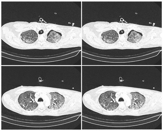 Lung ultrasound (LUS) was examined by means of a portable ultrasound system and a 2- to 5-MHz convex transducer (Sonosite Edge II, Fujifil Sonosite, Bohtell, WA, USA), and the LUS scoring system was applied in the supine position before (0 h), and 12, 24, and 48 h after, segmental lung recruitment. Patients’ posterior lungs were scanned in the lateral decubitus position on both sides, consecutively. LUS included examination of 12 lung regions: the upper and lower parts of the anterior, lateral, and posterior aspects of the left and right chest. Each region was scored from 0 to 3 points and the final LUS score was the sum of the points in all 12 regions and ranged from 0 to 36. The scoring was as follows: 0 points—presence of sliding lungs with A-lines or one or two isolated B-lines; 1 point—moderate loss of lung aeration with three to five B-lines; 2 points—severe loss of lung aeration with more than five B-lines (B-pattern); and 3 points—lung consolidation as shown in Figure 2 [14,15]. After the recruitment maneuver the CT scans were recorded to evaluate the persistence of atelectatic lung, as shown in Figure 3. For each patient, PaO2/FiO2 ratio and PaCO2 values were recorded before (0 h), and 12, 14, and 48 h after, the segmental lung recruitment.