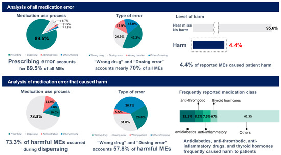 The majority of community pharmacist-reported cases of MEs in Korea were accounted for by prescription errors, most of which were near misses, and the process during which harmful MEs most commonly occurred was dispensing. The most common types of prescribing MEs were “wrong drug” followed by “dosing error,” while “dosing error” was the most frequent dispensing and administration error, followed by “wrong drug”.