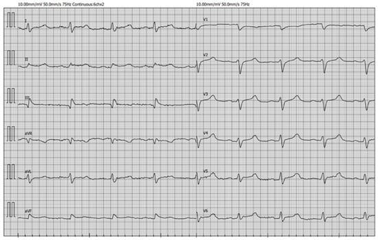 Admission ECG showing sinus tachycardia with slightly elevated ST segment in II, aVF leads.