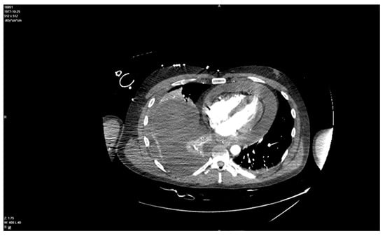 In our presented case, purulent pericarditis was caused by Streptococcus constellatus. Together with Streptococcus anginosus and Streptococcus intermedius, it forms the Streptococcus anginosus group (SAG). These Gram-positive pathogens can normally colonize the upper respiratory, digestive, and genitourinary tracts. However, in favorable conditions, SAG can cause invasive or non-invasive pyogenic infections and involve multiple organs []. Since purulent pericarditis is mostly caused by hematogenous seeding of bacteria, it is important to find a primary infection source. Though SAG can cause infection in any part of the body, more commonly they are isolated from skin and soft tissue lesions, peritonsillar, appendiceal, liver, brain, and lung abscesses [,]. From a search of the PubMed database, we identified 13 reports of purulent pericarditis caused by SAG [,,,,,,,,,,,,]. Out of these, only two cases were caused by Streptococcus constellatus [,]. In addition, five cases were described as primary pericardial inflammation, while others were secondary to pulmonary infection, liver abscess, gastropericardial fistula, cardiac surgery, advanced cancer, or as a complication of transbronchial needle aspiration. It is worth mentioning that as a part of oral microflora, SAG can spread to blood in patients with periodontal diseases []. Dental plaques and gingival bleeding after brushing teeth are also associated with an increased risk of bacteremia []. Another possible entry gate to the bloodstream is increased intestinal permeability. Similar to other pathogens, SAG can cross the damaged gastrointestinal barrier and cause infection in extraintestinal organs []. The work of Siegman-Igra et al. also pointed out possible SAG growth in urine in patients with urinary tract infections (UTIs) and clinically non-significant bacteriuria []. The majority of studies agree on predisposing factors for SAG infections. The significant risk factors for bacteremia are unhealthy diet, alcohol, smoking, dental and gastrointestinal surgery, underlying diseases such as diabetes, digestive tract malignancies, and chronic renal failure [,,,]. Apart from this, a significantly higher mortality rate was observed in patients over 65 years [].