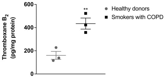 Levels of thromboxane B2 in pulmonary artery smooth muscle cells from COPD patients who smoke. Confluent human pulmonary artery smooth muscle cells from healthy donors and patients with COPD with a history of smoking were placed in a cell culture medium for 72 h. The medium was collected and the levels of thromboxane B2 were determined by ELISA. The results were normalised with total cell protein and expressed in pg/mg protein. Each data point represents the mean ± SEM using pulmonary artery smooth muscle cells from three healthy donors or smokers with COPD. ** p < 0.01 compared with pulmonary artery smooth muscle cells isolated from healthy donors.