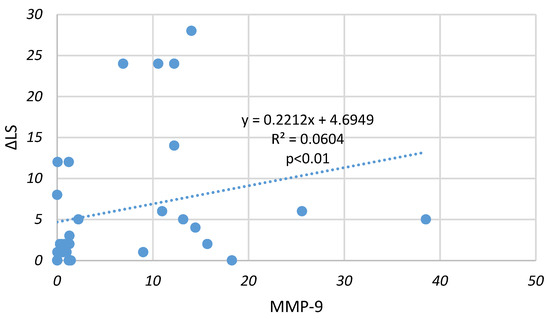 Correlation of MMP-9 in synovial fluid with annual changes of Larsen score (ΔLS) in patients with non-erosive RA.