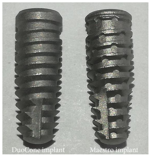 In the present study, two implant macrogeometries of Morse taper connection manufactured in Grade-4 titanium (Implacil De Bortoli, São Paulo, Brazil) were used, as described in the following: a DuoCone implant, which presents a regular conical macrogeometry with progressive trapezoidal threads and a cervical plane area of 1 mm; whereas, the Maestro implant shows a conical macrogeometry with progressive trapezoidal threads, a cervical plane area of 0.5 mm, and healing chambers between the threads. Figure 1 presents an image of the two implant macrogeometries.