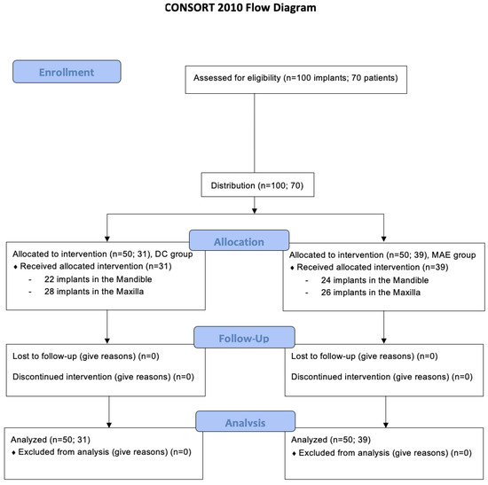 The patients were divided into two groups (n = 50 implants per group): 31 subjects for the DC group that received 28 implants in the maxilla and 22 implants in the mandible, and 39 subjects for the MAE group that received 26 implants in the maxilla and 24 implants in the mandible. All patients who needed more than one implant in different areas were included in the same group, and initially, they were all randomized (www.randomizer.org, accessed on 24 April 2022) and assigned to determine their group. Moreover, the following clinical information was collected: patient age, gender, implant location, implant macrogeometry, implant length, and implant diameter.