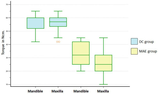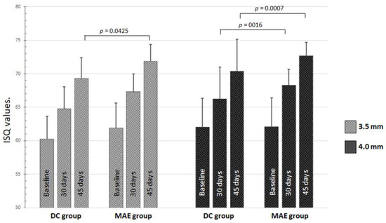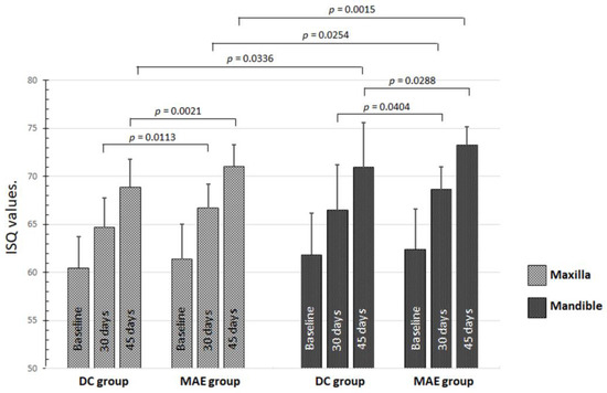 The evaluation of the average ISQ between the values measured in both directions (B-L and M-D) for both groups (Table 1) showed a significant difference between the groups after 30 days (p = 0.0004) and 45 days (p = 0.0001). The MAE group showed higher values than the DC group. In the intragroup and intergroup comparisons between implants placed in the maxilla and the mandible, there were no statistical differences (p > 0.05) for ISQ values at T1 (baseline). However, at other periods, statistical differences were detected, as shown in the graph in Figure 4.