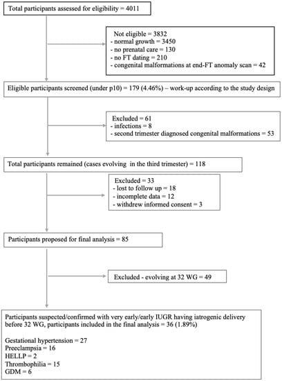 Our study targeted a very limited population of IUGR fetuses requiring early iatrogenic birth before 32 weeks. We confirmed the known association with hypertensive disorders in pregnancy [], which is present in 70% in this case series. We searched for associations with non-modifiable (hereditary thrombophilia []) and modifiable risk factors (smoking) [,].
