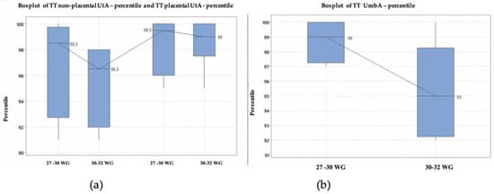 Doppler indices compared in the two subgroups: very early IUGR (requiring iatrogenic delivery between 27 and 29.6 weeks of gestation) and pregnancies which allowed continuing the pregnancy until 30–32 weeks of gestation. (a) The boxplot of placental and non-placental uterine artery assessed in the TT; (b) The boxplot of umbilical artery percentile. Abbreviations: TT third trimester, UtA uterine artery, WG weeks’ gestation, Umb A umbilical artery.