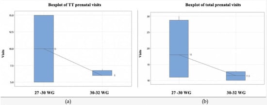 (a) The boxplot of TT prenatal visits; (b) The boxplot of total number of scheduled medical appointments. Abbreviations: WG weeks’ gestation, TT—third trimester.