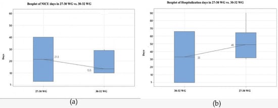 In the very early suspected IUGR subgroup, we had higher median values for NICU and total hospitalization days (21.5 days and 49 days, respectively) compared to the early suspected IUGR subgroup (Figure 4). Based on the Kruskal–Wallis test, the differences between medians are statistically significant (p < 0.01).