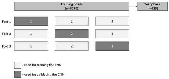 Schematic representation of three-fold cross-validation performed during the training phase. Frames were randomly divided into three equal groups from the total training set. We used two of the three created groups (66.7%) for training and one (33.3%) for model validation. We ran three runs with the aforementioned proportions but varying the groups used for training and validation. The remaining 10% of the data set was used to test CNN performance independently, during the validation phase.