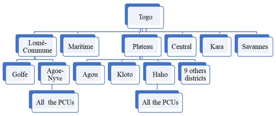 Togo is a French-speaking, West African country with a surface area of 56,600 km2 and a population of 7.71 million inhabitants in 2020 []. Togo is bordered in the north by Burkina-Faso, in the south by the Atlantic Ocean, in the west by Ghana, and in the east by Benin. The healthcare system of the country is organized into three levels []: