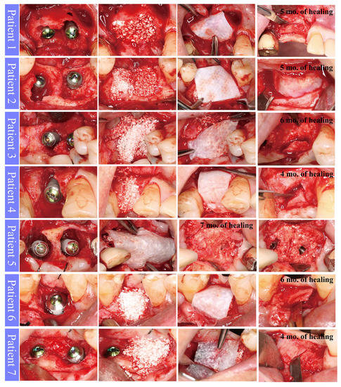 - Poomprakobsri, K.; Kan, J.Y.; Rungcharassaeng, K.; Lozada, J.; Oyoyo, U. Exposure of Barriers Used in Guided Bone Regeneration: Rate, Timing, Management, and Effect on Grafted Bone—A Retrospective Analysis. J. Oral Implant. 2022, 48, 27–36. [Google Scholar] [CrossRef] [PubMed]